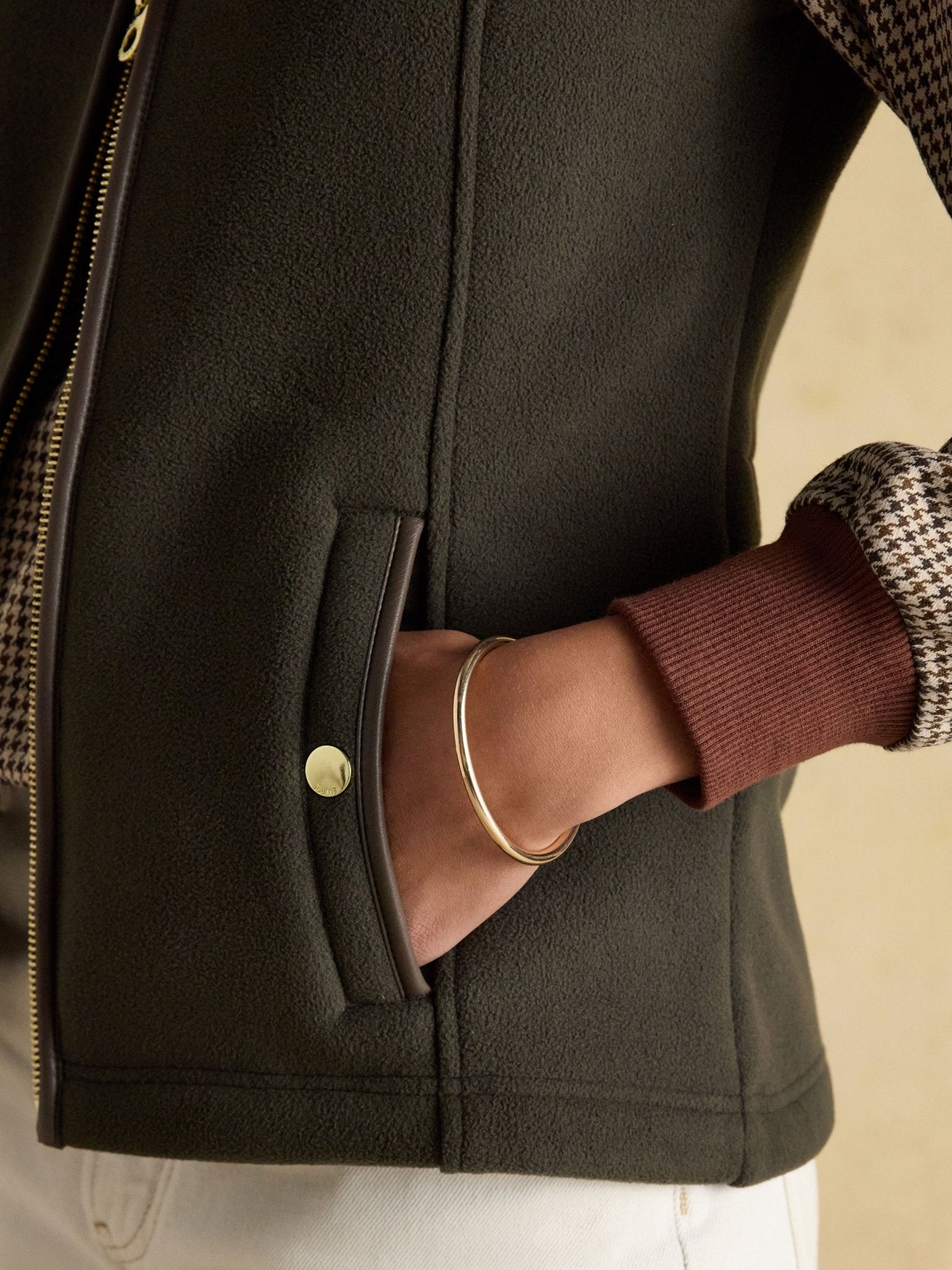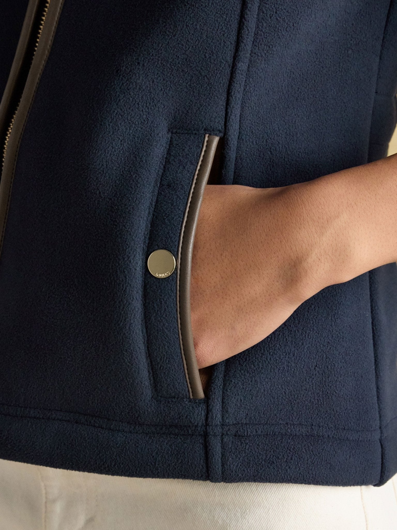 Sleek and stylish, this Joules women's heritage fleece gilet delivers effortless layering for the colder months. Constructed from sumptuous navy fleece crafted from 100% recycled polyester, it combines comfort with environmental responsibility. The funnel neck design provides extra warmth around the shoulders, whilst the full zip fastening allows for easy adjustment throughout the day. Practical popper pockets keep essentials secure, and the adjustable waist ensures a flattering, customisable fit. Finished with PU binding along the neck zip edge, pocket edges and armholes for durability and refined detailing, this versatile gilet works beautifully layered over a top or shirt, or worn beneath a jacket when temperatures plummet. An essential piece for any woman's cold-weather wardrobe.